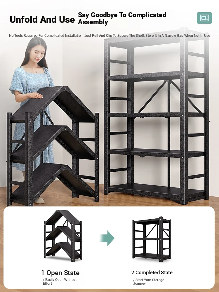 Foldable Iron Multi-Layer Bookshelf and Storage Rack - No Installation Required, Perfect for Home Use, Kitchen Organization, and Versatile Storage Solutions!