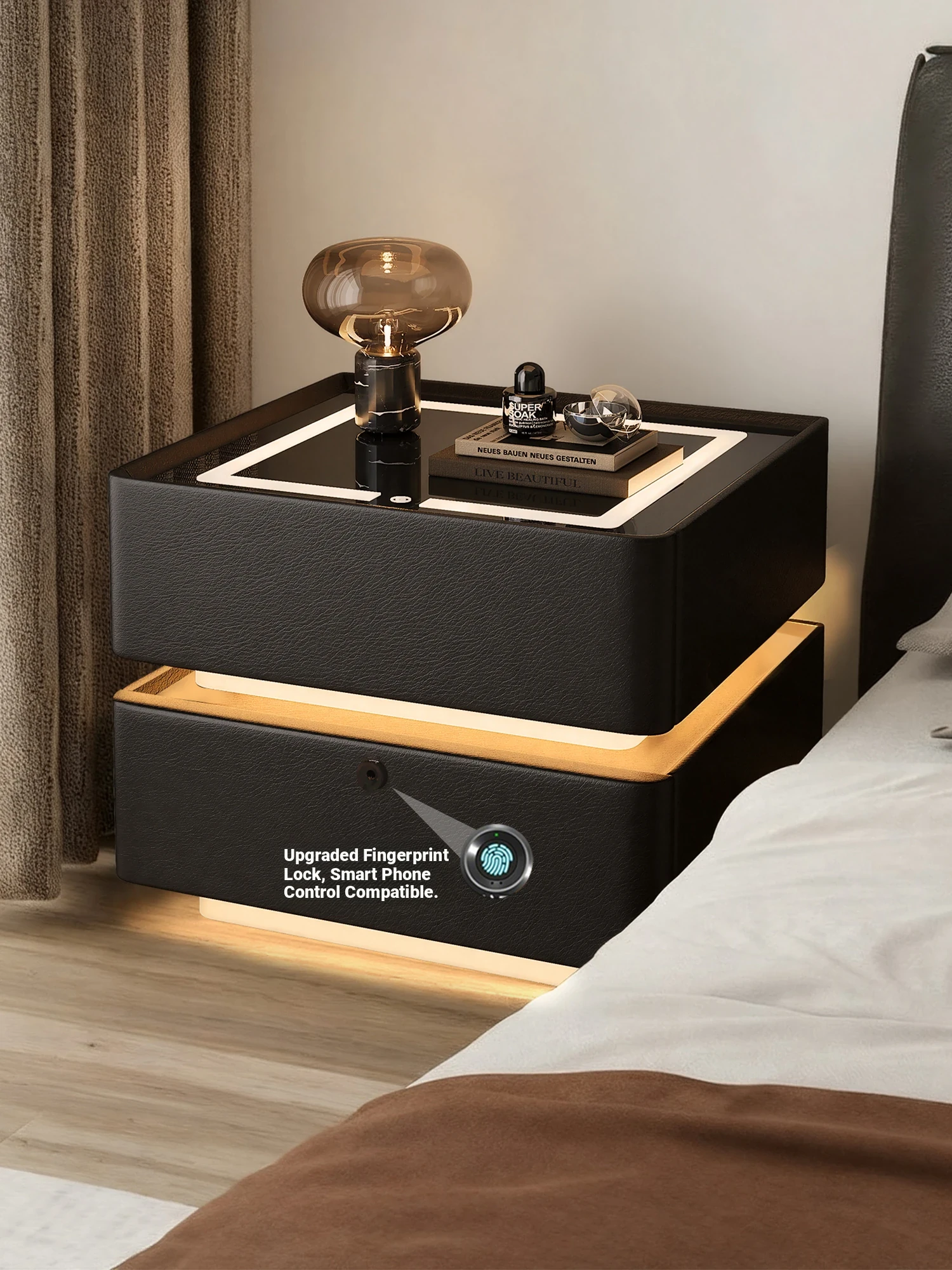 Smart Nightstand - Modern Black Solid Wood Bedside Cabinet with Fingerprint Lock, Elegant Storage Solution for Your Bedroom, Perfect Blend of Minimalism and Luxury.