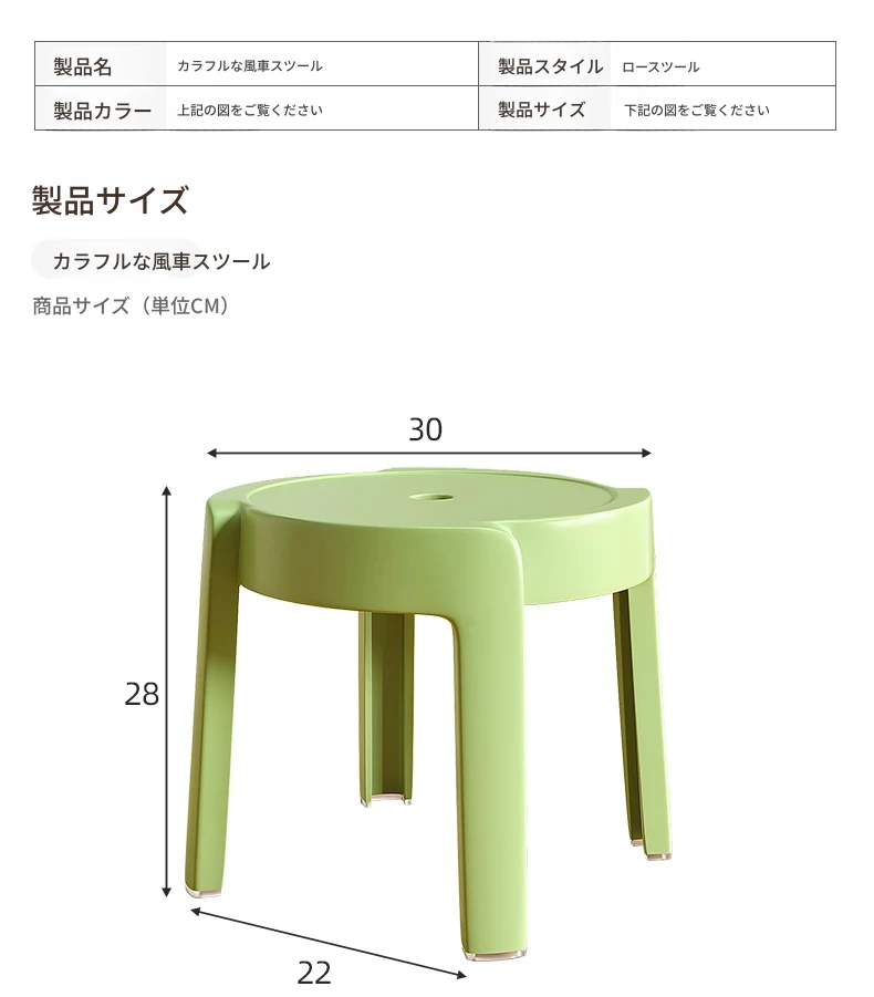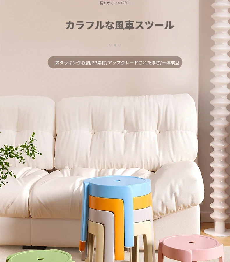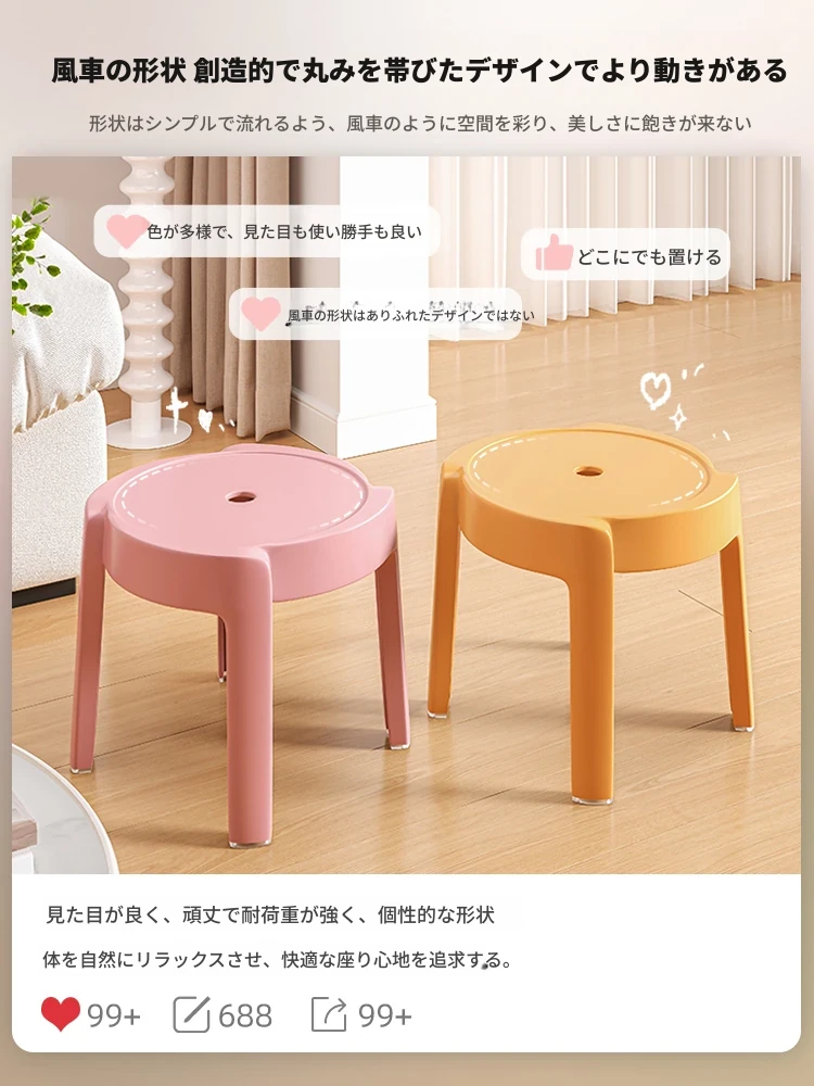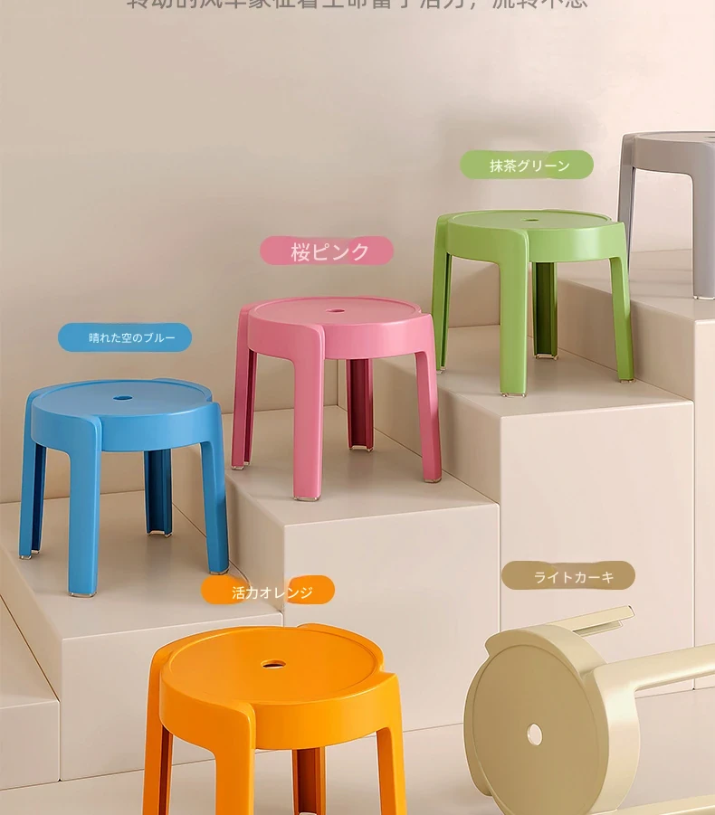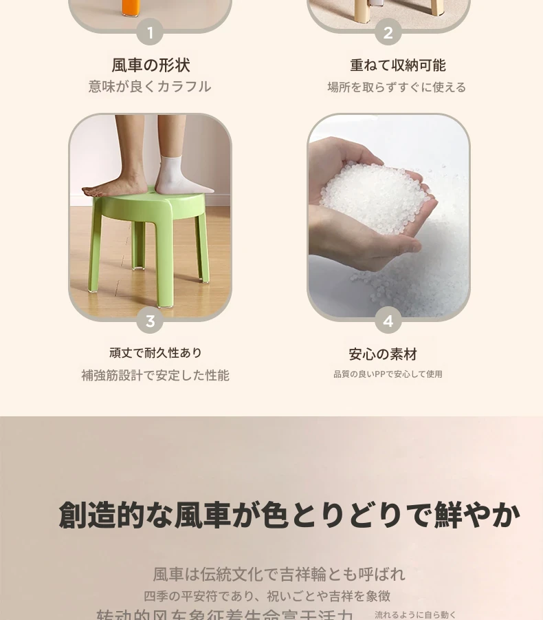 重ねられるプラスチック製スツール|家庭用・厚手・滑り止め付き|風車デザインでおしゃれなリビングやテーブルに最適|バスルームや円形スツールとしても使える便利なアイテム!