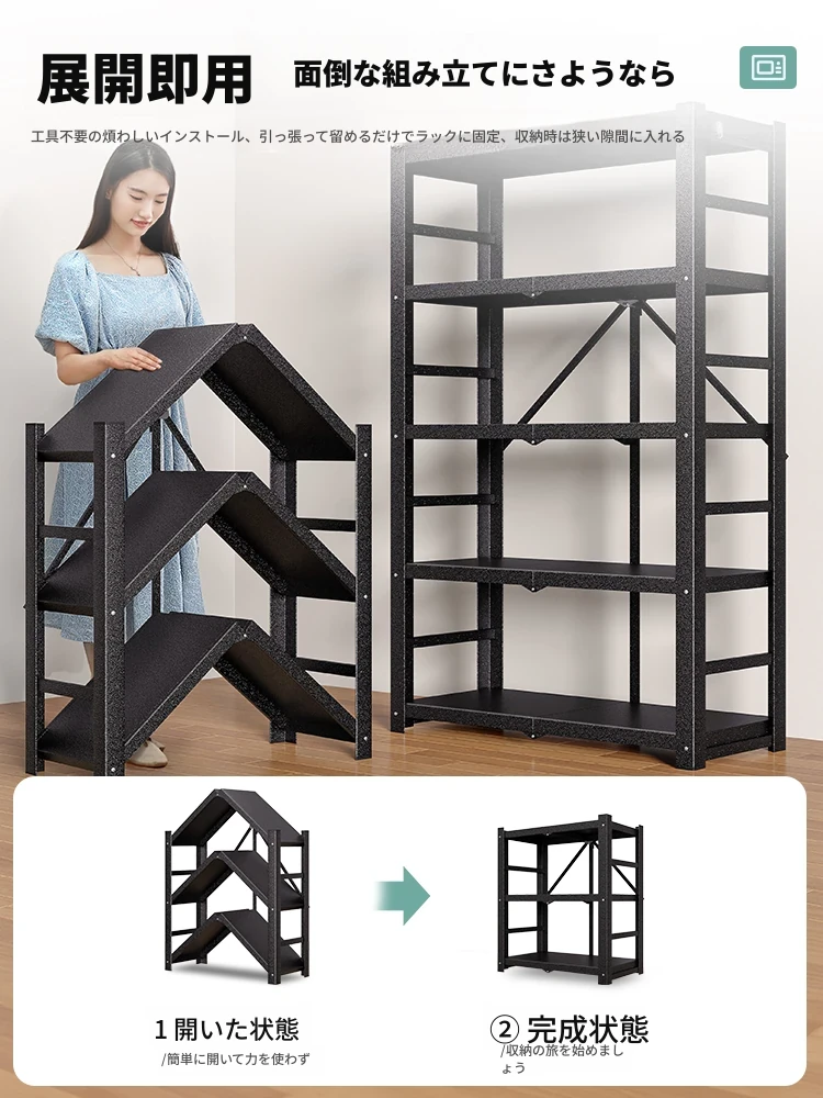 取り付け不要の折りたたみ式ブックシェルフ!家庭用アイアン製の多段収納ラック。キッチンやリビングで大活躍!省スペースでおしゃれな収納を実現。あなたのお部屋をスッキリ整理整頓!
