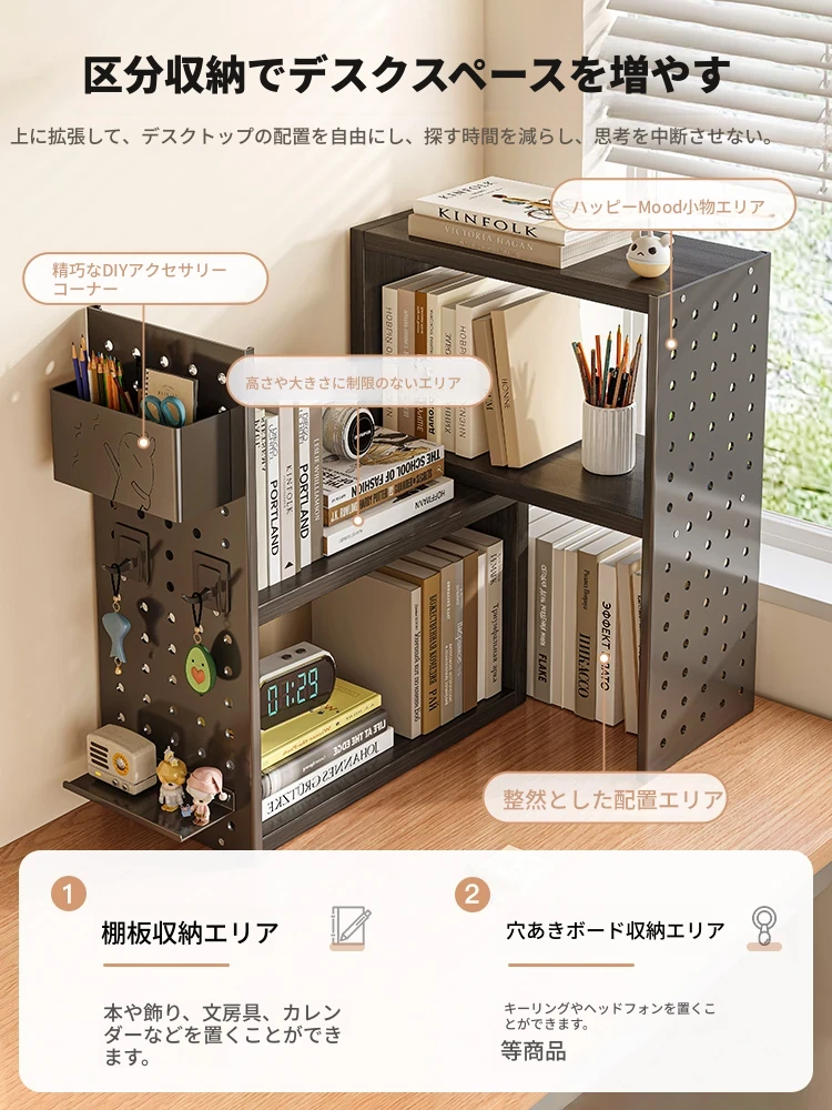伸縮可能なコーナーデスク収納ラック!おしゃれな穴あきボードデザインで、デスク上のスペースを有効活用。書籍や文具をスタイリッシュに整理して、快適なオフィス環境を実現します。