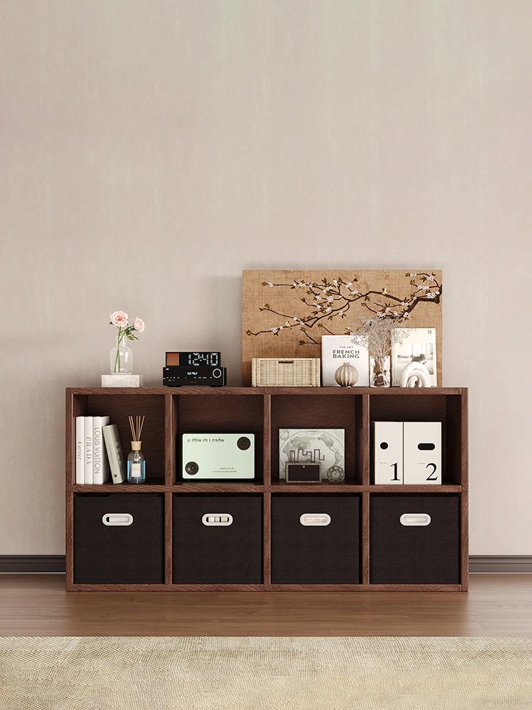 ウォールナット色の実木製グリッドキャビネット、引き出し付きのスタンド式書棚。8つのスペースで収納力抜群!おしゃれで機能的な収納家具で、お部屋をスッキリ整理整頓。あなたの生活空間にぴったりのアイテムです!