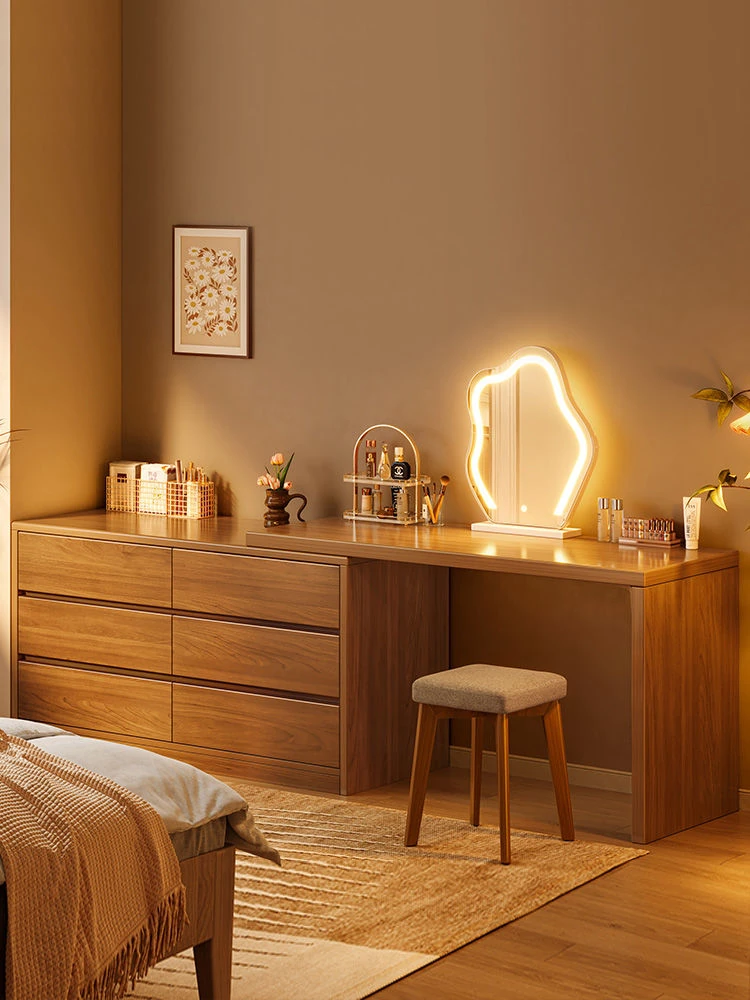 シンプルでモダンなデザインの実木製ドレッシングテーブル - ベッドサイドにぴったりの6段チェストと一体型の新しい中式メイクアップデスク収納キャビネット。美を引き立てる洗練された空間を演出!