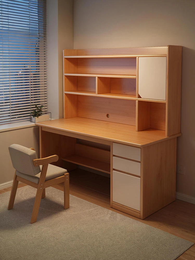 天然木製の書斎デスク&ドレッサー|女性向け、学生にも最適!自宅学習や在宅勤務に最適な一体型デザイン、収納棚付きで便利!おしゃれな寝室を演出します。