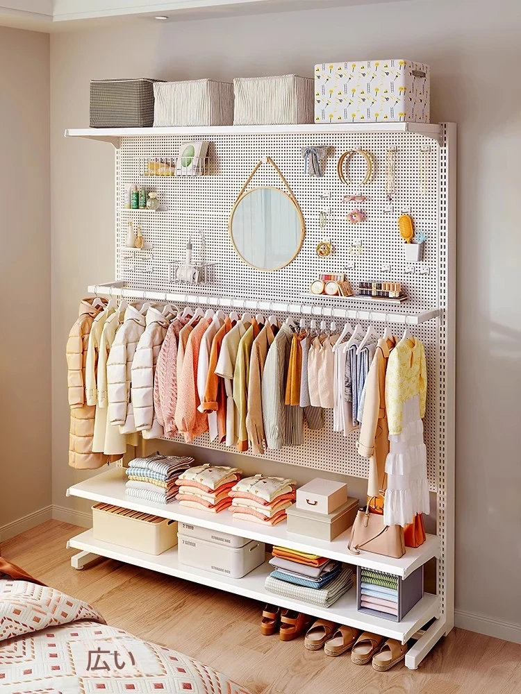 穴あきボードハンガー付き簡易クローゼット - おしゃれな金属製オープン収納ラック、寝室にぴったりな衣類収納スペースを実現!あなたの生活空間をスッキリ整えます。