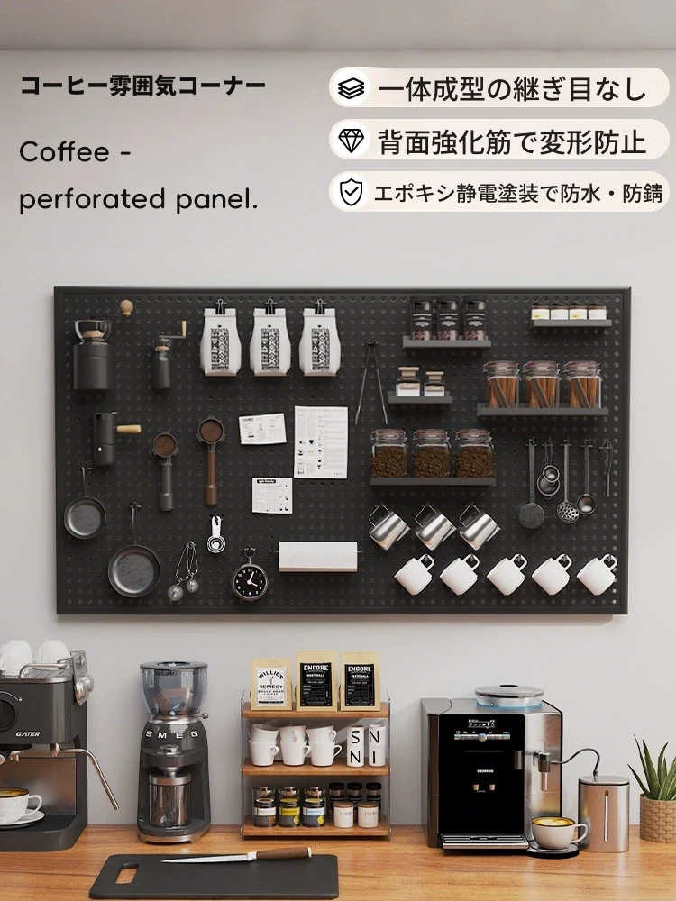 カフェコーナー金属パネル収納ラック 壁掛けハンドルラック ステンレス製パンチングボード おしゃれな壁面ディスプレイ収納 使いやすさとデザイン性を兼ね備えた優れたアイテム!