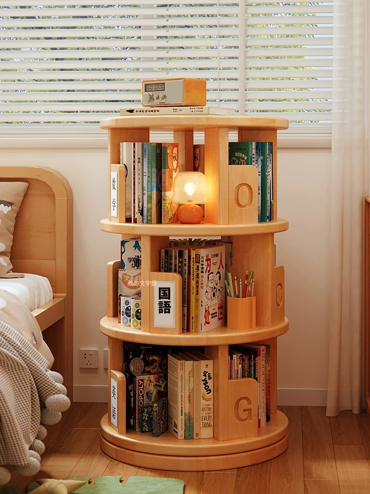 360度回転する無垢材製書棚 - 寝室や子供部屋に最適なスタイリッシュな置物ラック!省スペース設計でベッドサイドにもぴったり。おしゃれで機能的なインテリアを実現します!