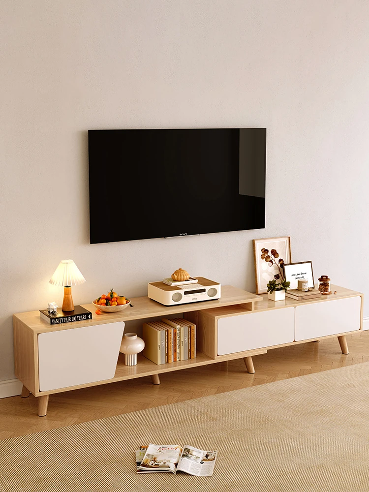 北欧風のミニマリストテレビ台セット - 実木脚の伸縮式コーヒーテーブル付き、コンパクトなリビングに最適なモダンデザイン!おしゃれな小型住宅にぴったりの機能的なテレビボード。