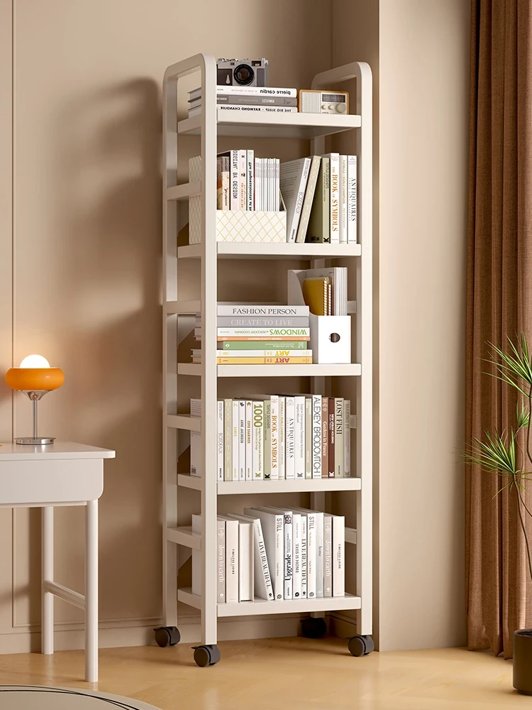 アイアン製の移動式ブックシェルフ - 多層設計で、キャスター付きのコンパクトな収納棚。デスク横や壁際にぴったりフィット!シンプルでスタイリッシュな収納ソリューション。