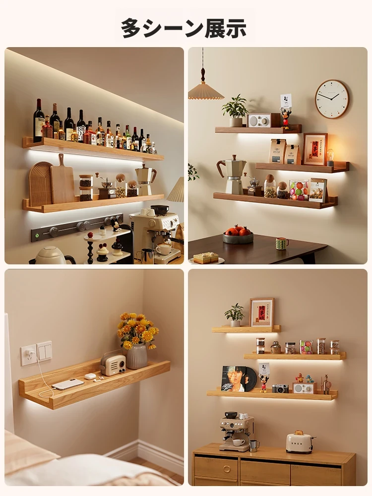 壁掛けシェルフ 木製 無打孔 一字型 パイン材 リビング用 家庭用 ウォールデコレーション 隔板 ライト付き おしゃれで実用的、空間を有効活用!
