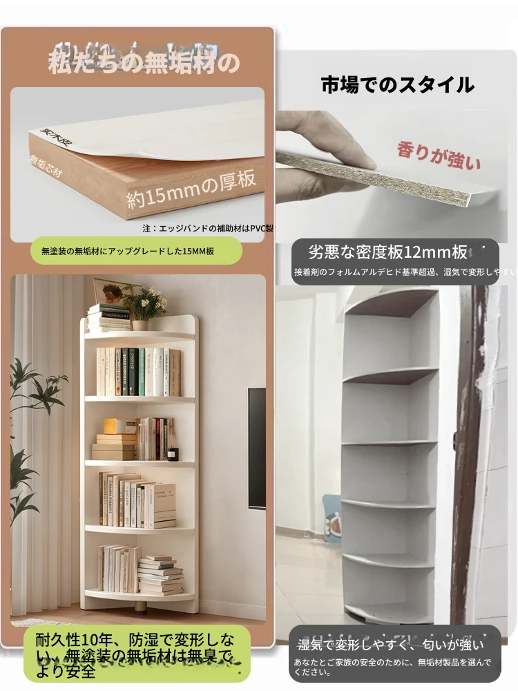 天然木材製のコーナー書棚、スタイリッシュな収納ラック!リビングにぴったり、壁にぴったりフィットするスリムデザイン。家の収納力をアップし、スッキリとした空間を実現します!